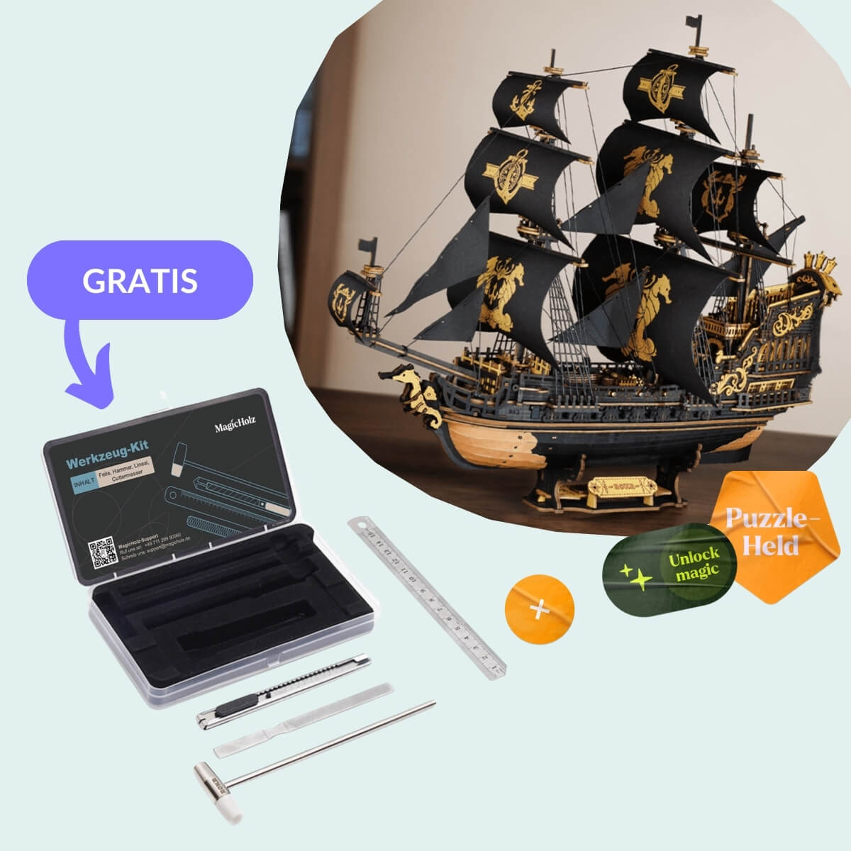 Du baust kein Modell, Du baust Dein eigenes Piratenschiff. Planke für Planke wächst es unter Deinen Händen, trägt Sorgen fort wie die Wellen Gold und Geschichten tragen. Jede Stunde daran ist Dein stiller Hafen – oder ein Geschenk für Seelen, die Abenteuer verdienen. Kein Kleber, keine Hast – nur Holz, Hände, Herz. Wenn Dein Schiff ausläuft, bleibt es nicht im Hafen: Es ankert stolz in Deinem Heim. Ein Beweis, dass Du mehr bist als Matrose – Du bist Kapitän.